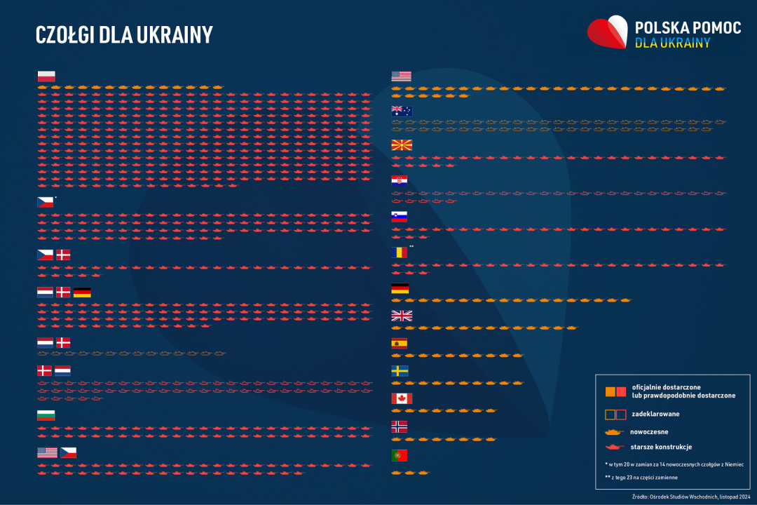 Як інформується, із майже 800 танків, які отримала Україна, понад 350 їй передала Польща. Це, зокрема, понад 240 танків Т-72 різних типів, 60 танків PT-91 та 14 сучасних танків Leopard 2A4.