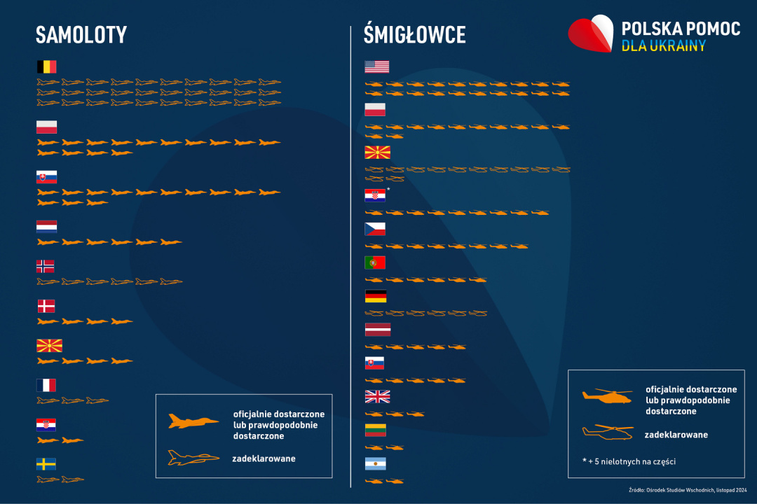 Польща також передала 14 літаків МіГ-29 і 12 вертольотів Мі-24, при цьому перші польські літаки потрапили до України у березні 2023 року.