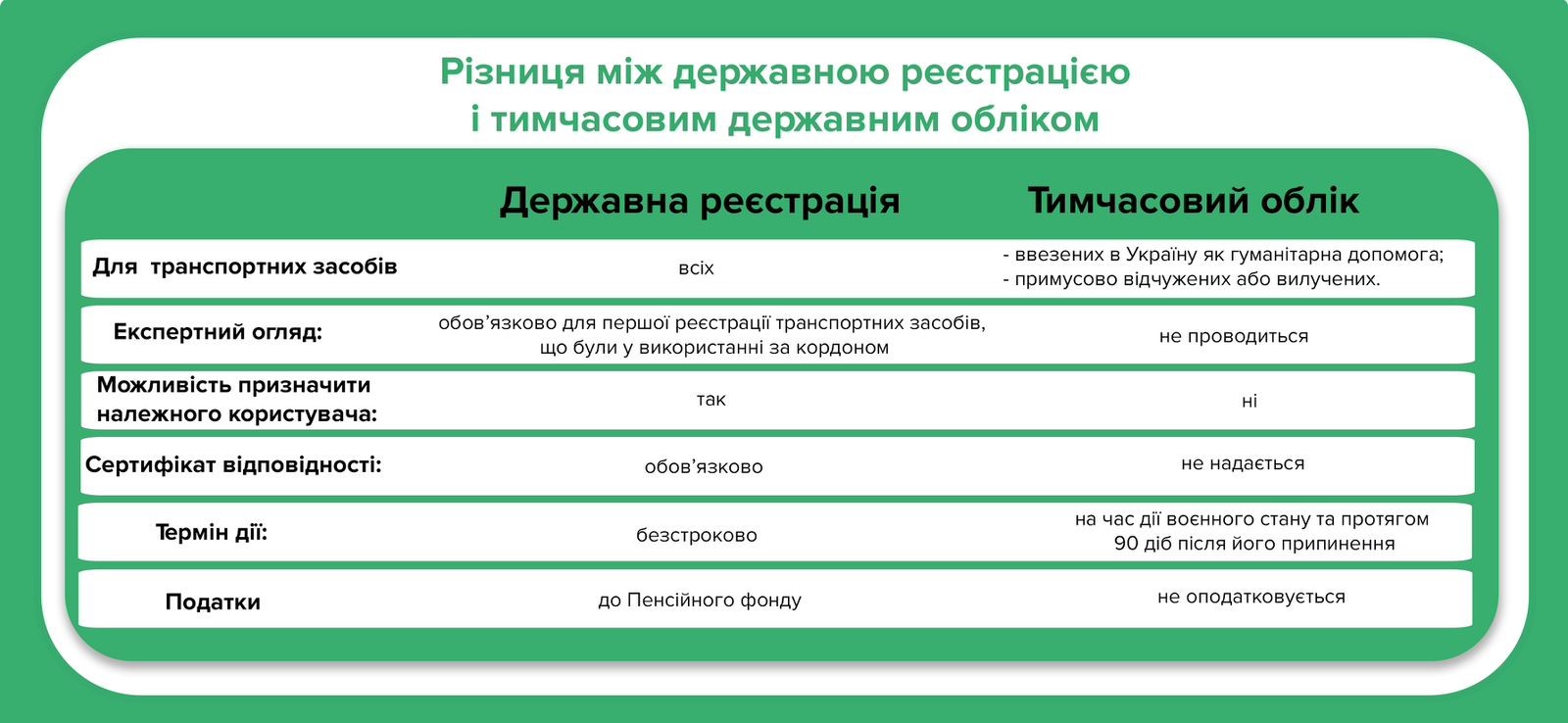 При тимчасовій реєстрації не потрібно сплачувати податок до Пенсійного фонду, проходити Експертне дослідження та надавати сертифікат відповідності. Видається тимчасовий реєстраційний талон у паперовому вигляді.