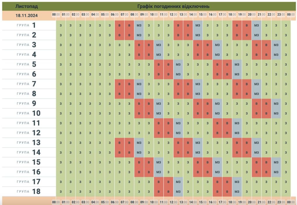 Як зазначають в обленерго, у графіку погодинних вимкнень відображаються години гарантованого ввімкнення електроенергії (зелені клітинки) та години, коли ваші оселі будуть точно знеструмлені (позначені червоним кольором).