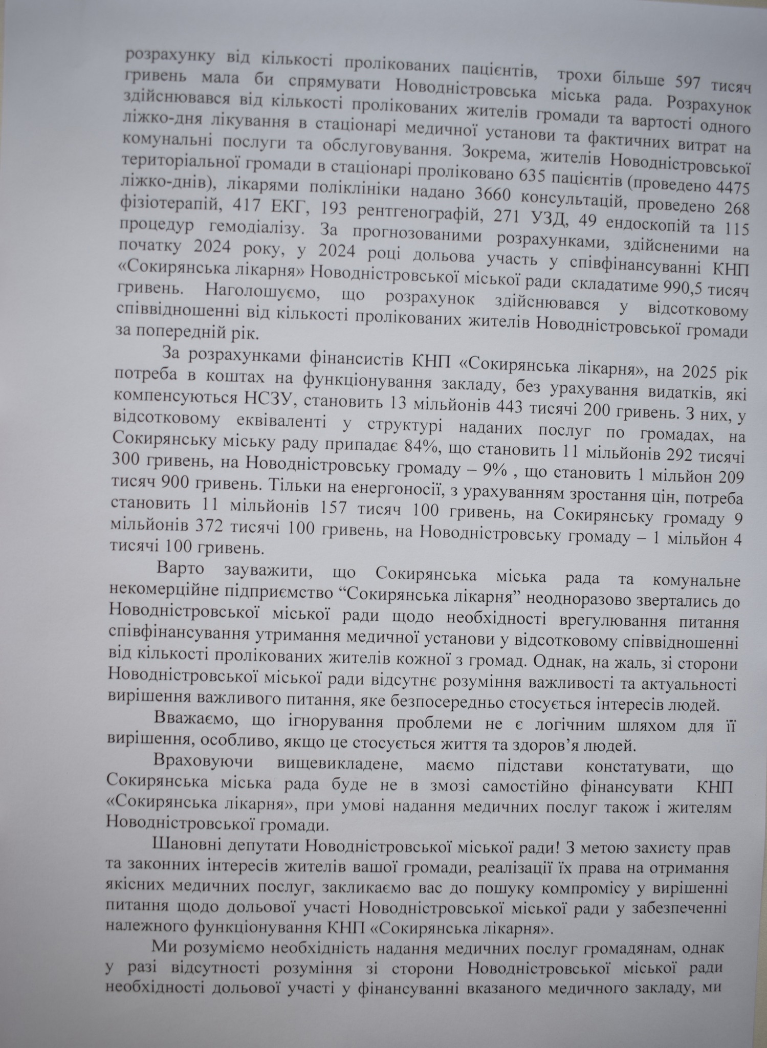 На утримання КНП «Сокирянська лікарня» за 9 місяців 2024 року з бюджету Сокирянської міської територіальної громади спрямовано майже 6,6 мільйонів гривень. З них, у розрахунку від кількості пролікованих пацієнтів, трохи більше 597 тисяч гривень мала би спрямувати Новодністровська міська рада. Загалом у 2024 році дольова участь у співфінансуванні КНП «Сокирянська лікарня» Новодністровської міської ради орієнтовно складатиме 990,5 тисяч гривень. Вварто зауважити, що розрахунок здійснювався у відсотковому співвідношенні від кількості пролікованих жителів Новодністровської громади за попередній рік.