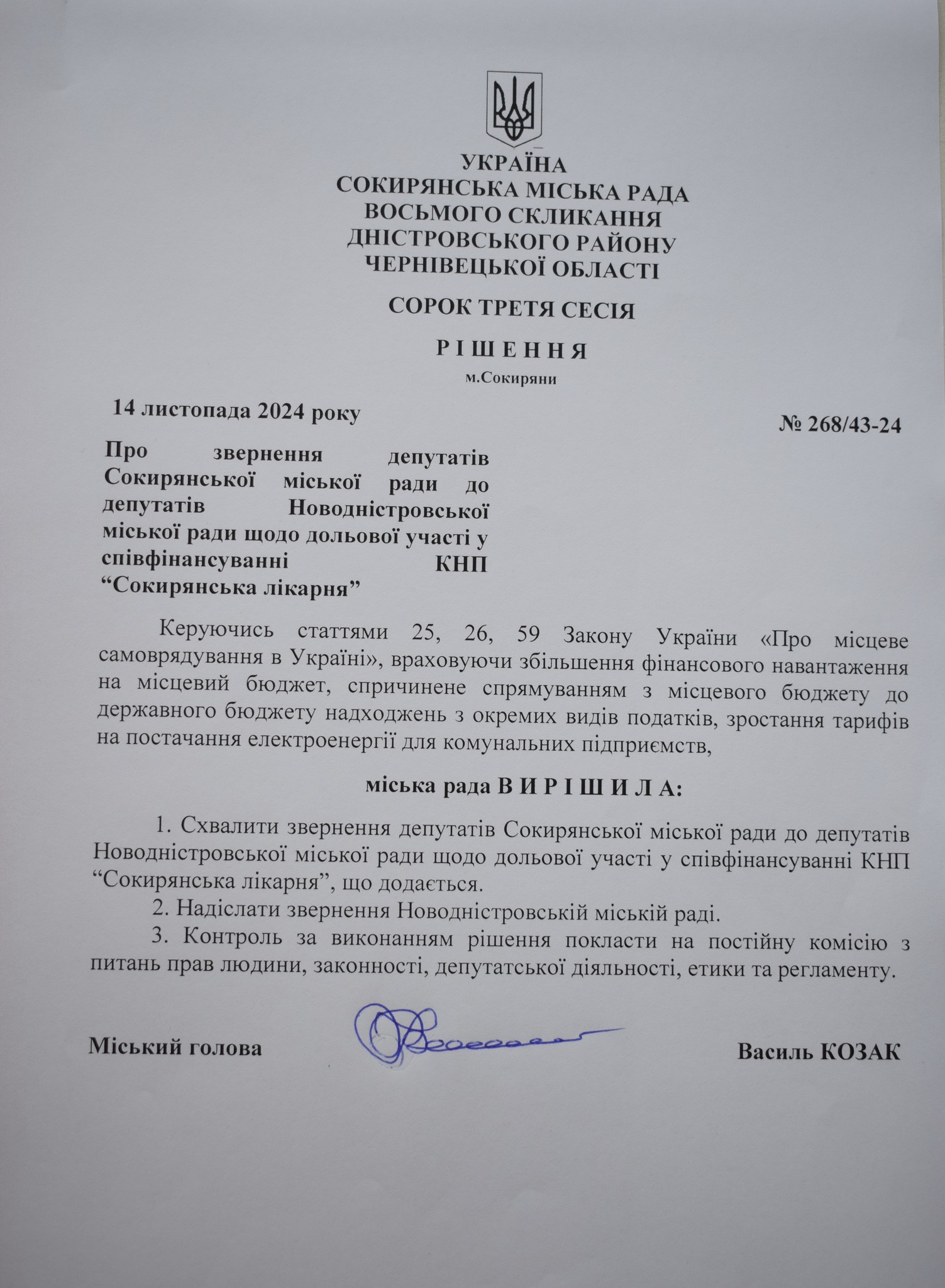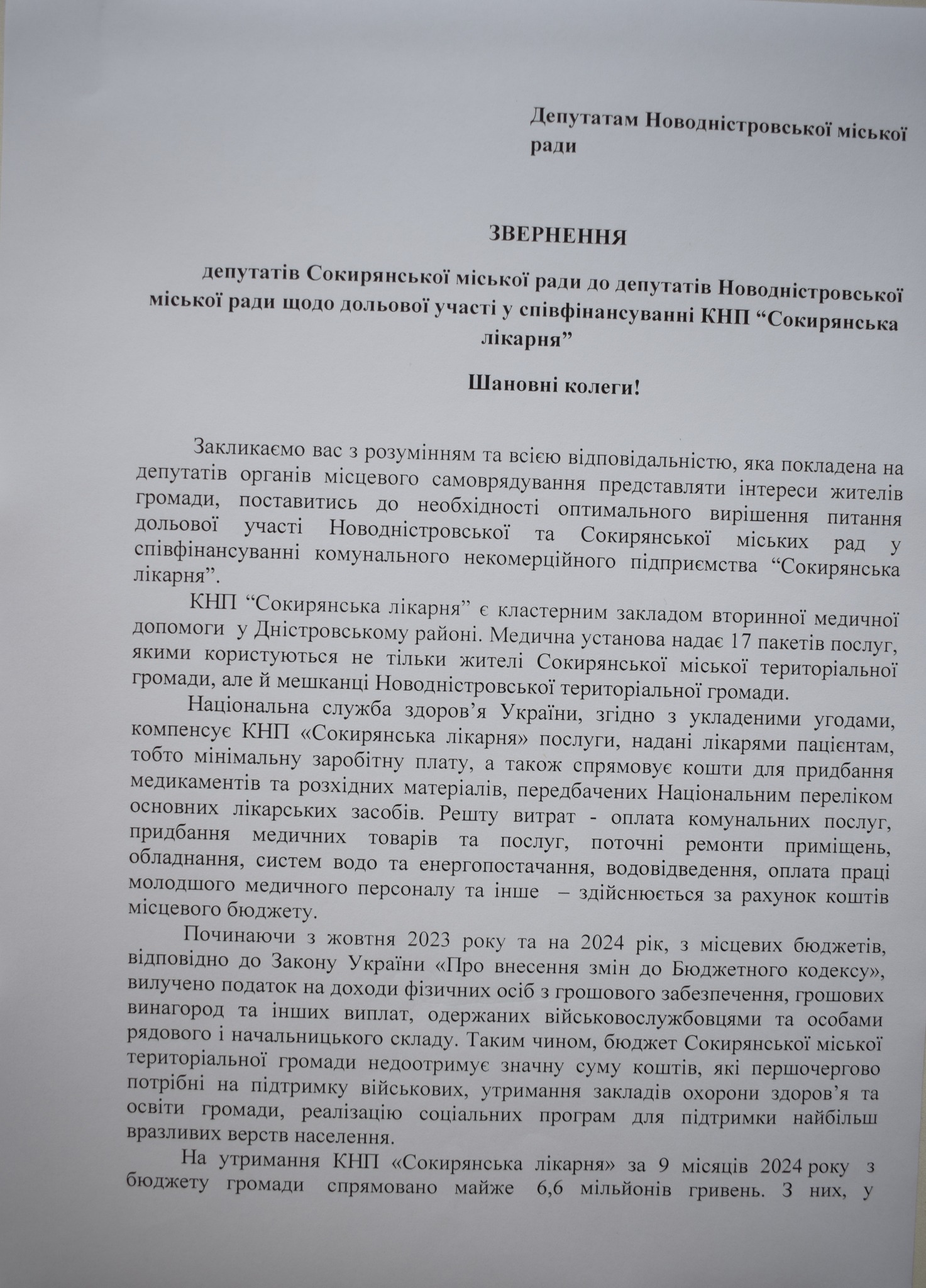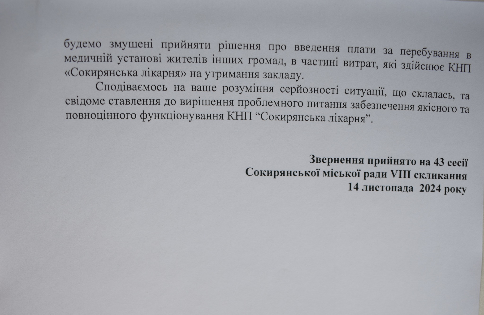 В ході сорок третьої сесії Сокирянської міської ради восьмого скликання депутати ухвалили рішення звернутись до депутатів Новодністровської міської ради щодо дольової участі у співфінансуванні КНП «Сокирянська лікарня»