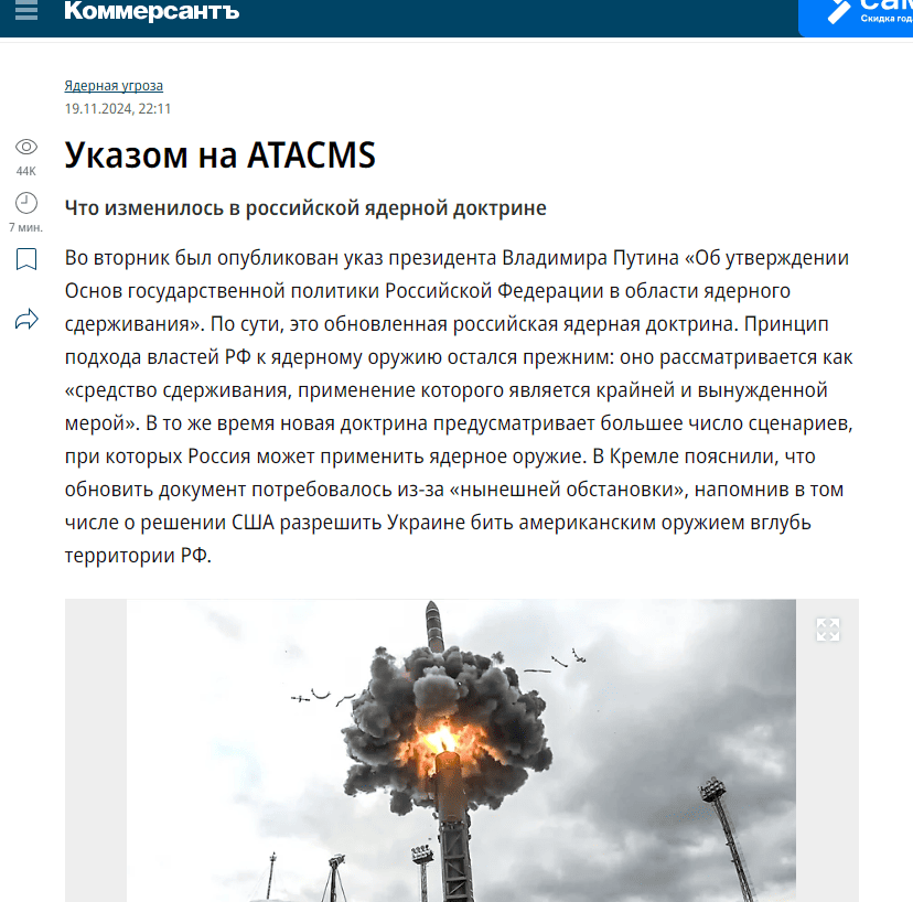 Зміна або як її офіційно називають в Кремлі, «уточнення» документа під назвою «Основи державної політики у РФ в галузі ядерного стримування», не може вважатися відповіддю на будь-які дії Сил оборони України, рішення іноземних держав, ухвалені або озвучені у листопаді.