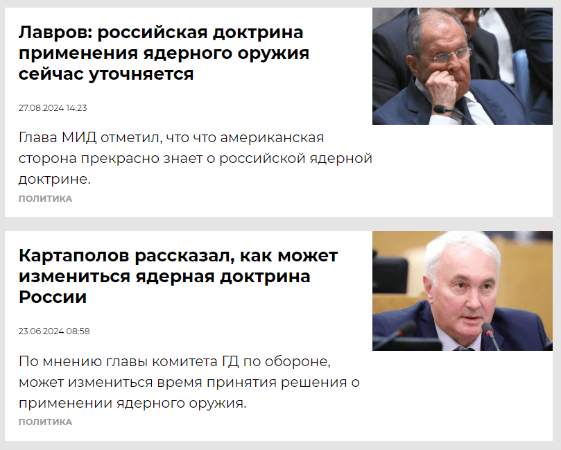 Адже «уточнення» доктрини голова МЗС РФ Сєргєй Лавров і диктатор Путін особисто почергово анонсували у серпні, липні та червні. Протягом літа ‒ осені зміни активно коментували російські можновладці та інші «балакучі голови» з метою створення додаткових інфоприводів та тримання теми в інформаційному полі.