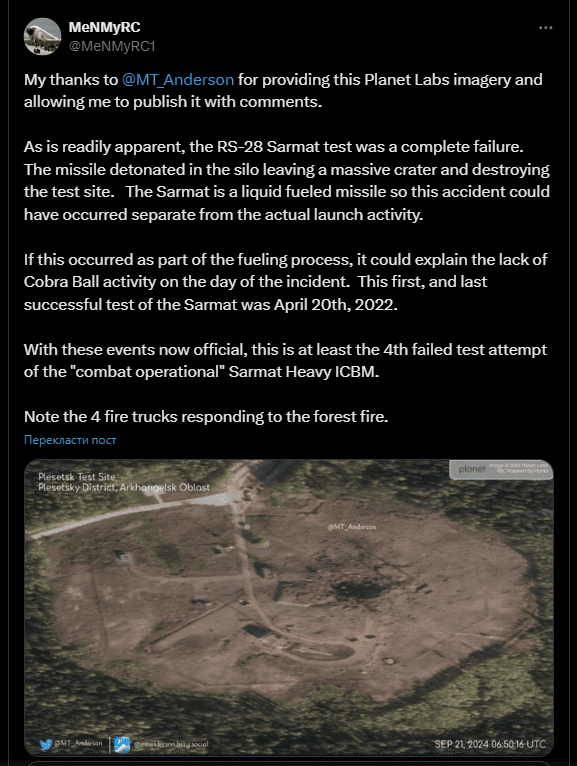 Крім інформаційних заходів, Кремль вдається і до кінетичних дій; демонстративного переміщення ядерних озброєнь до Білорусі, навчань із застосуванням тактичної ядерної зброї та випробувань засобів доставки стратегічних зарядів. Інформаційний вплив від анонсованого «уточнення» ядерної доктрини  мав бути посилений ефектом успішних випробувань міжконтинентальної балістичної ракети. Однак, судячи з усього, розрахунок не виправдався. 21 вересня OSINT-аналітики, що спеціалізуються на дослідженні ядерного потенціалу РФ, оприлюднили супутниковий знімок воронки на полігоні у Плесецьку.  Вона могла утворитися внаслідок вибуху ракети РС-28 «Сармат» у пусковій шахті.