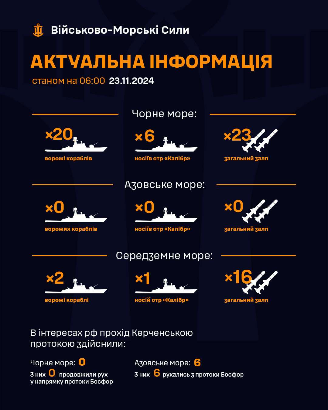 Про це повідомляє Укрінформ з посиланням на оперативну інформацію ВМС ЗСУ станом на 06:00 23.11.2024 у Фейсбуці.
