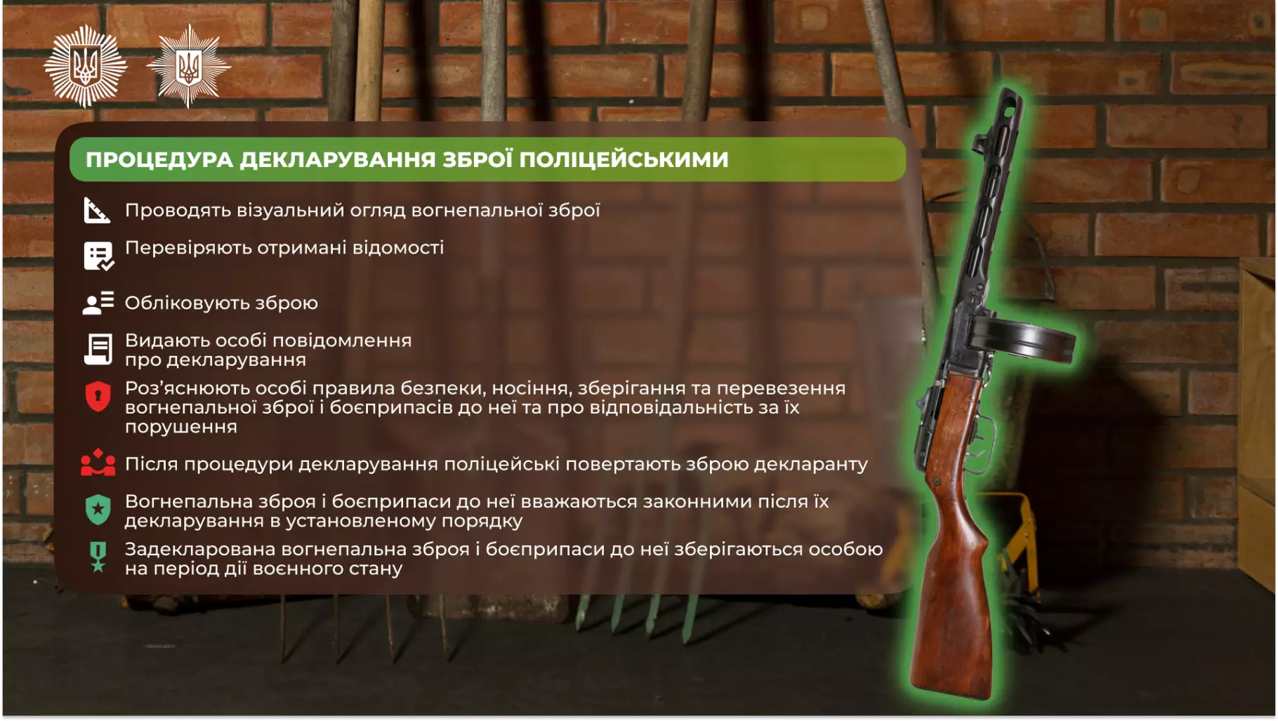 Якщо ви знайшли вогнепальну зброю та боєприпаси до неї, вам необхідно негайно їх задекларувати. Зробити це можна у підрозділах Національної поліції.