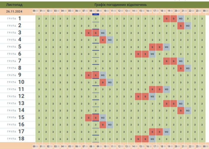 Як зазначають в обленерго, у графіку погодинних вимкнень відображаються години гарантованого ввімкнення електроенергії (зелені клітинки) та години, коли ваші оселі будуть точно знеструмлені (позначені червоним кольором).