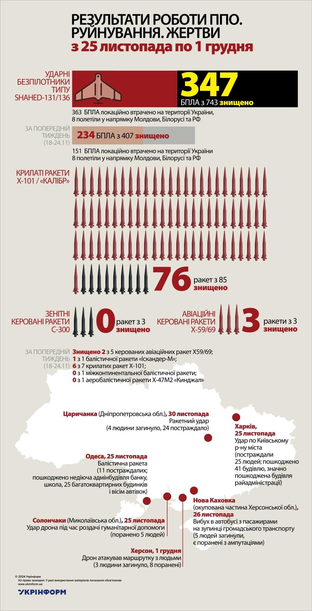 Внаслідок обстрілів російськими окупантами з 25.11 по 01.12 Донецької, Херсонської, Сумської, Запорізької та Харківської областей 9 людей загинуло, 70 отримали поранення.