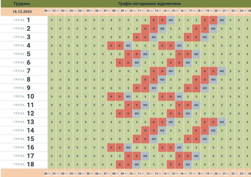Як зазначають в обленерго, у графіку погодинних вимкнень відображаються години гарантованого ввімкнення електроенергії (зелені клітинки) та години, коли ваші оселі будуть точно знеструмлені (позначені червоним кольором).