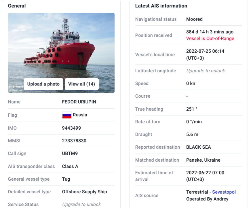 Буксир «Федір Урюпін», згідно з базою Marinetraffic, має російський прапор, але власником вказане українське ДАТ «Чорноморнафтогаз».