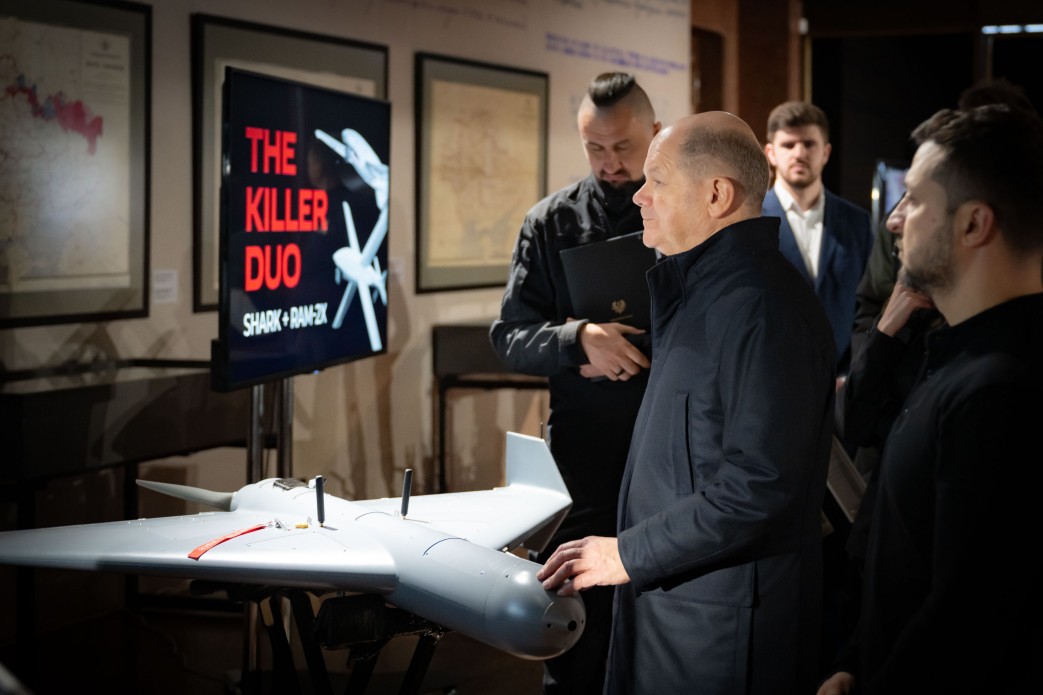 Також під час візиту Шольца на фото потрапив український БПЛА, зовні схожий на іранський Shahed-136.