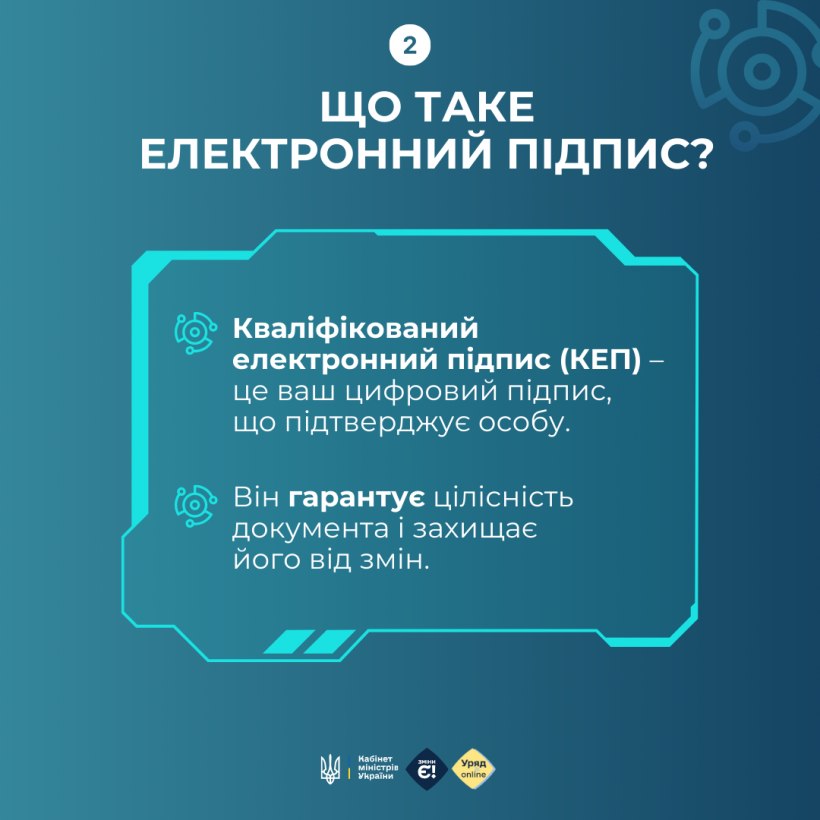Електронний підпис (КЕП) дозволяє підписувати документи онлайн та користуватися державними послугами. Він гарантує цілісність документа і захищає його від змін.