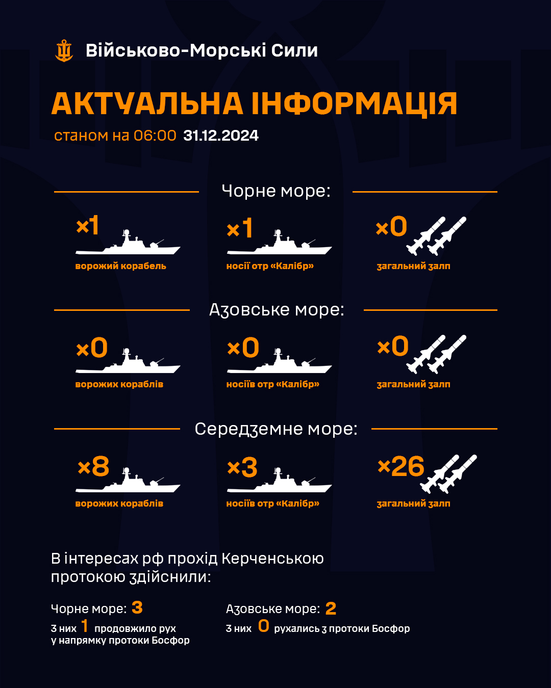 "Станом на 06:00 31.12.2024: в Чорному морі 1 ворожий корабель, якій є носієм крилатих ракет "Калібр", ракети відсутні; в Азовському морі ворожі кораблі відсутні;