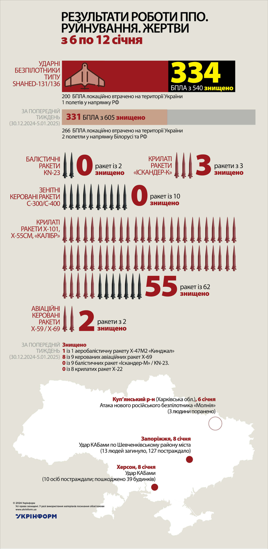 Внаслідок обстрілів російськими окупантами з 06.01 по 12.01 Донецької, Херсонської, Запорізької, Дніпропетровської та Харківської областей 10 людей загинуло, 70 отримали поранення.