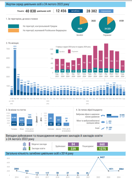 Загалом від початку повномасштабного вторгнення Росії в Україну загинули 12 456 цивільних. Ще 28 382 людини отримали різного роду поранення.
