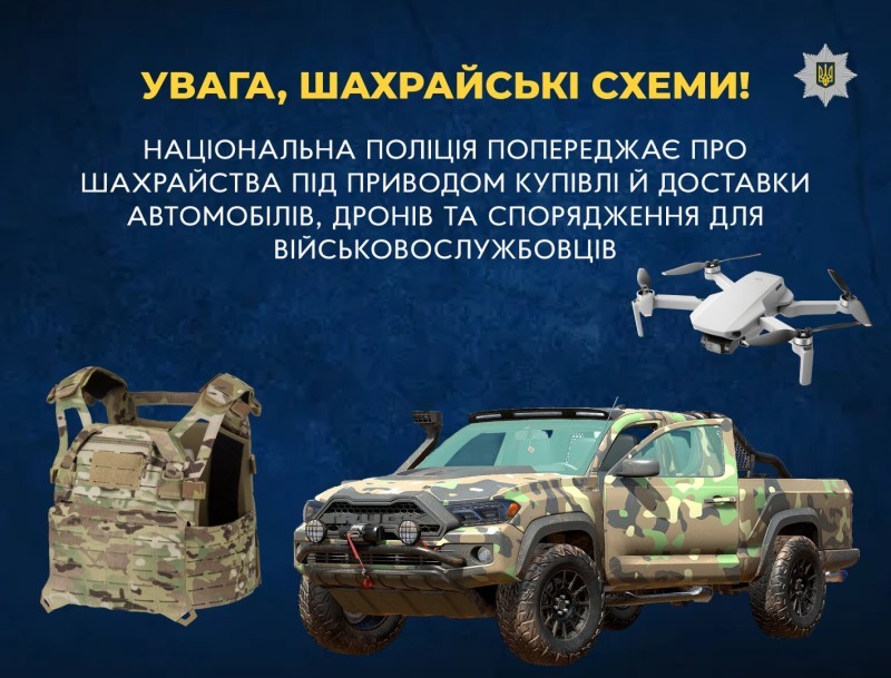 Увага, шахрайські схеми! Національна поліція попереджає про шахрайства під приводом купівлі й доставки автомобілів, дронів та спорядження для військовослужбовців