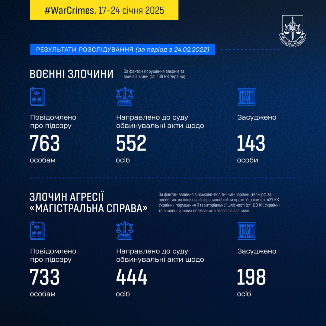 Окрім того, упродовж тижня правоохоронці зареєстрували 751 злочин агресії і воєнний злочин, а також 94 злочини проти національної безпеки.