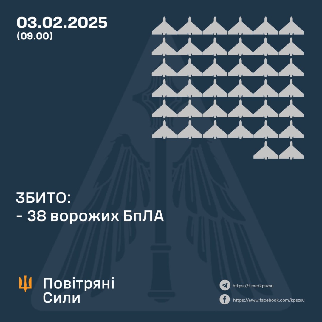 Станом на 09:00 понеділка, 3 лютого, підтверджено збиття 38 ударних БПЛА типу Shahed і безпілотників інших типів у Харківській, Полтавській, Сумській, Київській, Чернігівській, Черкаській, Запорізькій, Дніпропетровській, Вінницькій та Хмельницькій областях.