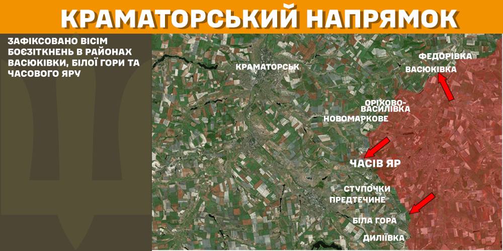 На Краматорському напрямку зафіксовані вісім боєзіткнень у районах Васюківки, Білої Гори та Часового Яру.
