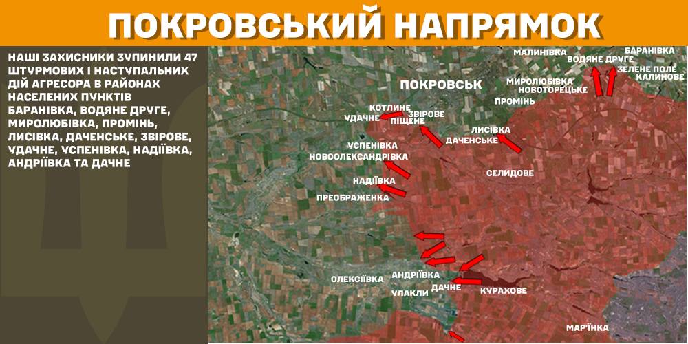 На Покровському напрямку захисники України зупинили 47 штурмових і наступальних дій російської армії у районах населених пунктів Баранівка, Водяне Друге, Миролюбівка, Промінь, Лисівка, Даченське, Звірове, Удачне, Успенівка, Надіївка, Андріївка і Дачне.