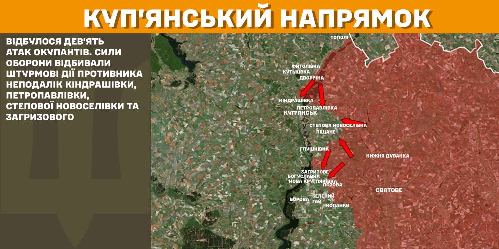 На Куп’янському напрямку за добу сталося дев’ять російських атак. Сили оборони відбивали штурмові дії ворога неподалік Кіндрашівки, Петропавлівки, Степової Новоселівки та Загризового.