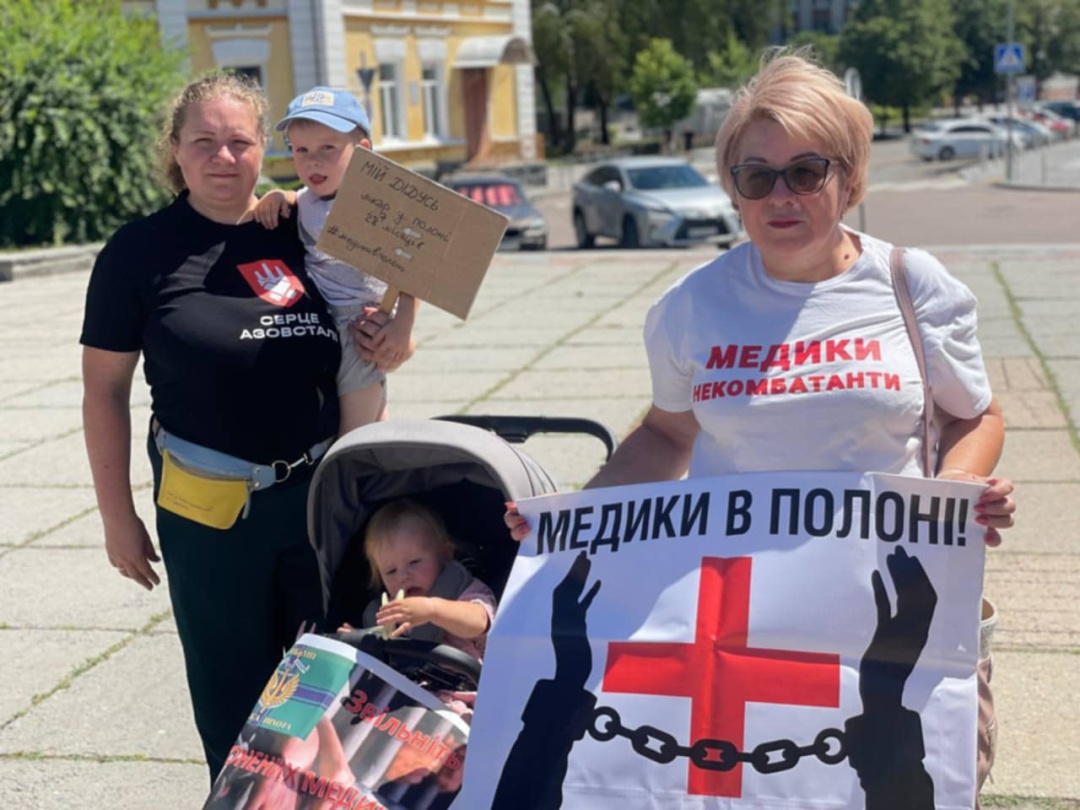 Жінка з малюками у дитячому візочку і плакатами «Медики в полоні», «Мій дідусь в полоні», «Медики – некомбатанти» понад рік ходила на акції підтримки українських полонених у Житомирі, куди сім’я переїхала після початку повномасштабної війни. І вона продовжуватиме це робити – оскільки свекор все ще в полоні.