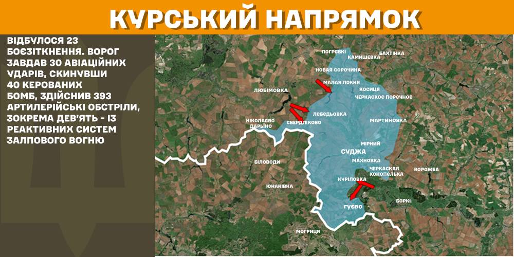 На Курському напрямку сталося 23 боєзіткнення. Росіяни завдали 30 авіаційних ударів, скинувши 40 керованих бомб, здійснили 393 артилерійські обстріли, зокрема дев’ять – із реактивних систем залпового вогню.