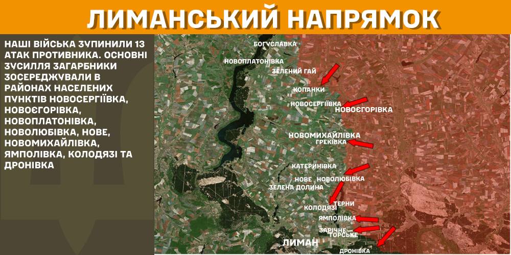 На Лиманському напрямку українські війська зупинили 13 ворожих атак. Основні зусилля загарбники зосереджували в районах населених пунктів Новосергіївка, Новоєгорівка, Новоплатонівка, Новолюбівка, Нове, Новомихайлівка, Ямполівка, Колодязі і Дронівка.