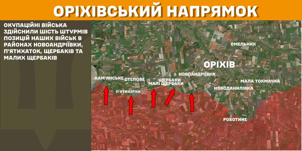 На Оріхівському напрямку російські війська здійснили шість штурмів позицій Сил оборони в районах Новоандріївки, П'ятихаток, Щербаків та Малих Щербаків.