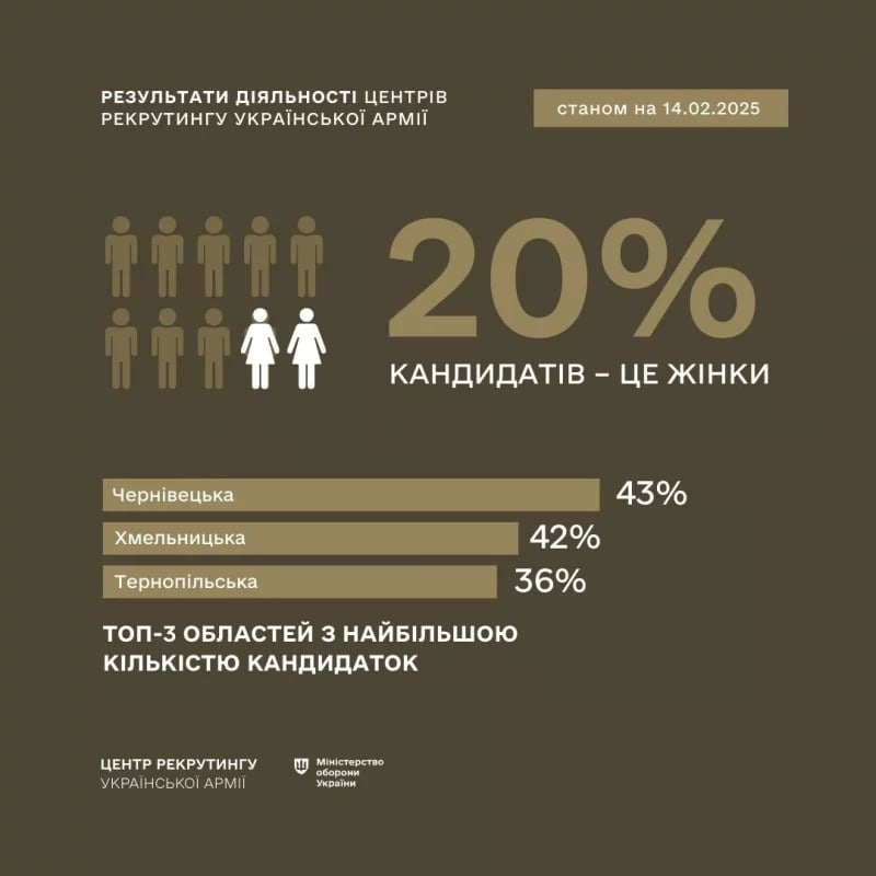 Станом на 14 лютого 2025 року до мережі центрів рекрутингу української армії звернулося 41 296 осіб. Маємо вже 8553 кандидатів.