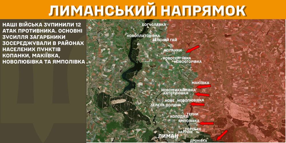 На Лиманському напрямку українські війська зупинили 12 російських атак. Основні зусилля загарбники зосереджували в районах Копанок, Макіївки, Новолюбівки та Ямполівки.