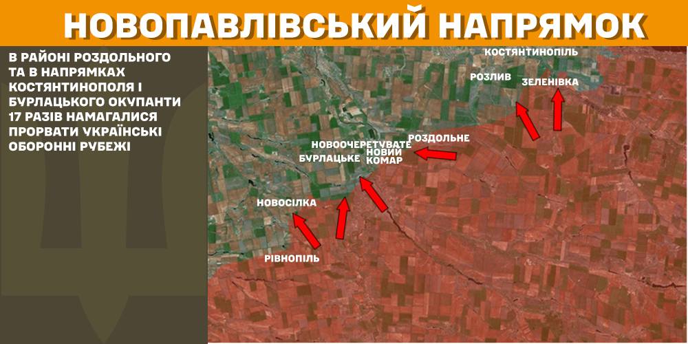 Сили оборони продовжують стримувати ворога на Новопавлівському напрямку. В районі Роздольного та в напрямках Костянтинополя і Бурлацького росіяни 17 разів намагалися прорвати українські оборонні рубежі.