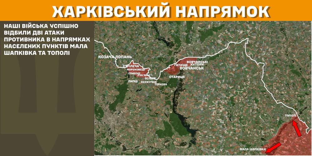 На Харківському напрямку минулої доби українські війська успішно відбили дві ворожі атаки в напрямках Малої Шапківки і Тополь.
