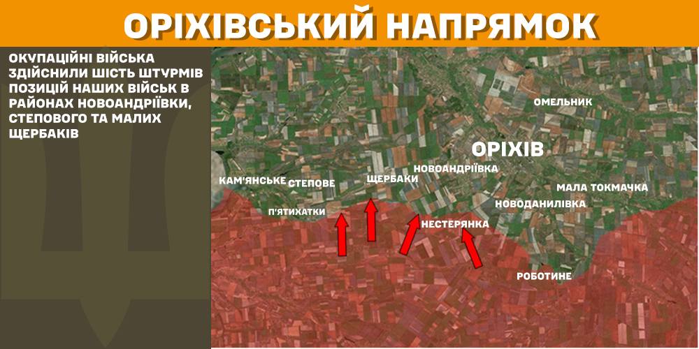 На Оріхівському напрямку загарбники здійснили шість штурмів у районах Новоандріївки, Степового та Малих Щербаків.
