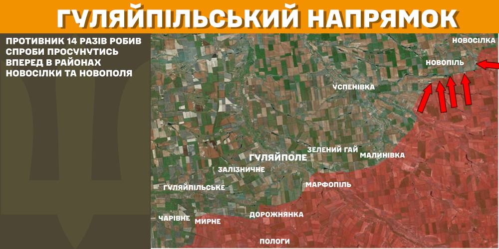 На Гуляйпільському напрямку російські війська 14 разів робили спроби просунутись у районах Новосілки та Новополя.