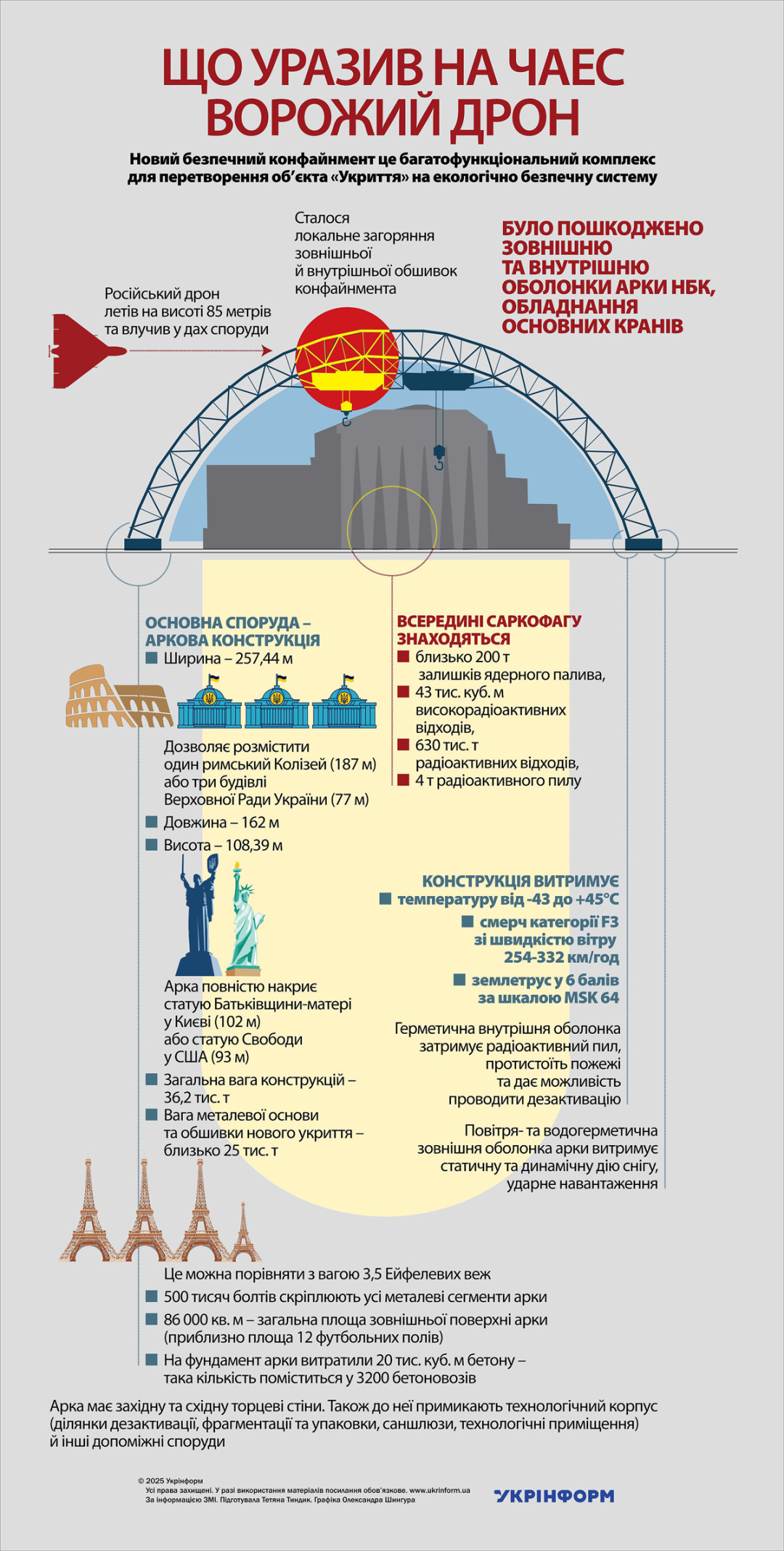 Було пошкоджено зовнішню та внутрішню оболонку (обшивку) арки НБК та обладнання основних кранів