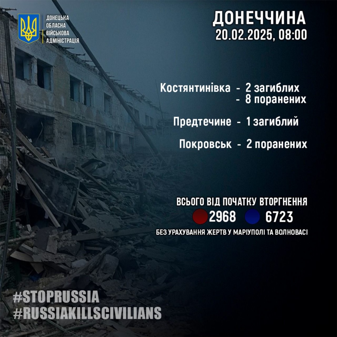 "За 19 лютого росіяни вбили трьох жителів Донеччини: двох у Костянтинівці і одного у Предтечиному. Ще 10 людей в області за добу дістали поранення", – ідеться у повідомленні.