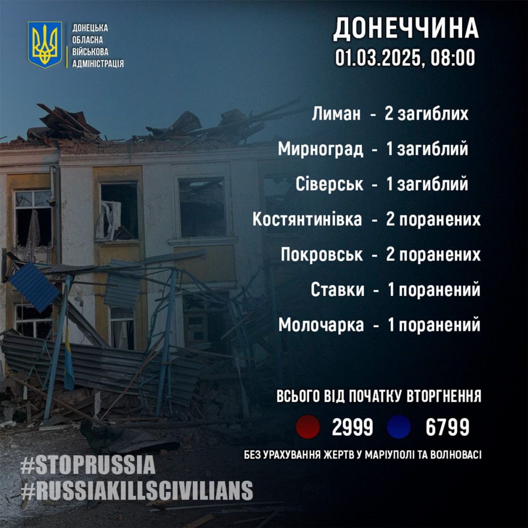 Згідно з оприлюдненою інфографікою, загалом від початку повномасштабної війни на Донеччині загинули 2999 людей та 6799 дістали поранення. Дані наведені без урахування жертв у Маріуполі та Волновасі.