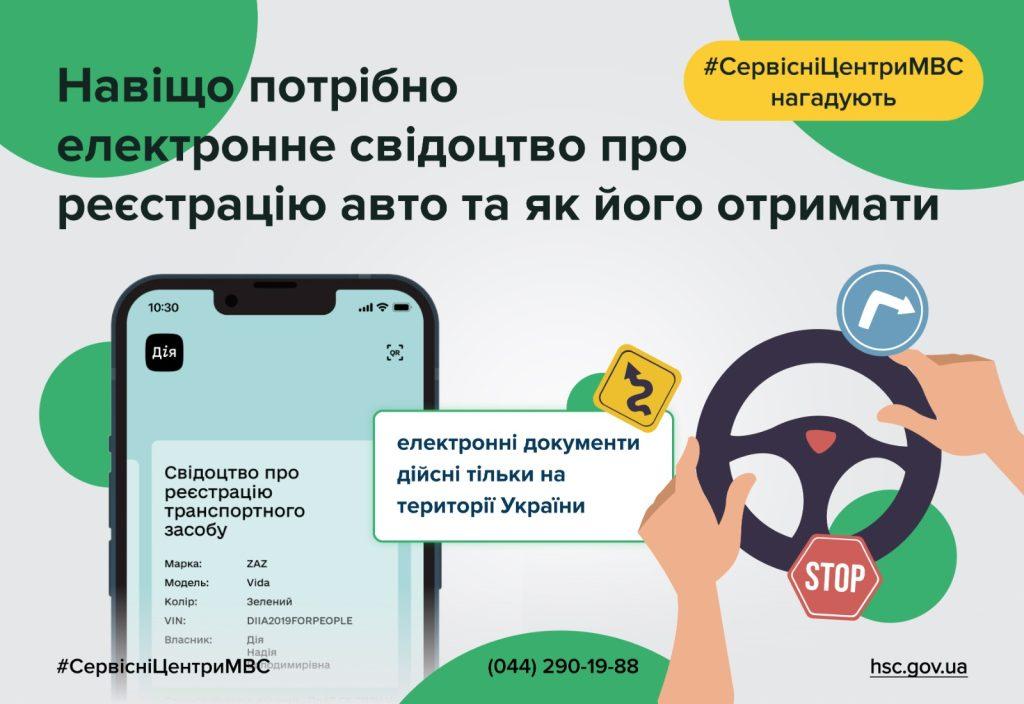 Для отримання електронного свідоцтва про реєстрацію транспортного засобу необхідно звернутись до будь-якого зручного сервісного центру МВС для перереєстрації авто. Під час отримання послуги необхідно попередити адміністратора про намір отримати свідоцтво виключно в електронному форматі без пластикового бланка. Документ буде містити серію та номер. Однак, звертаємо увагу, що електронні документи дійсні тільки на території України.