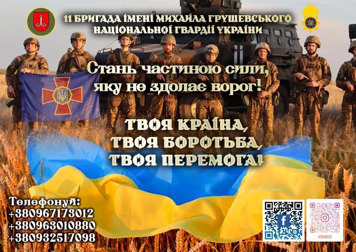 11 бригада ім. М. Грушевського Південного оперативно-територіального об’єднання Національної гвардії України запрошує до своїх лав громадян, які готові обороняти Україну та проявляти бойову звитягу, силу та відвагу