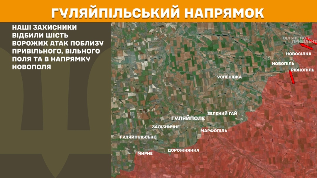 На Гуляйпільському напрямку українські захисники відбили шість ворожих атак поблизу Привільного, Вільного Поля і в напрямку Новополя.