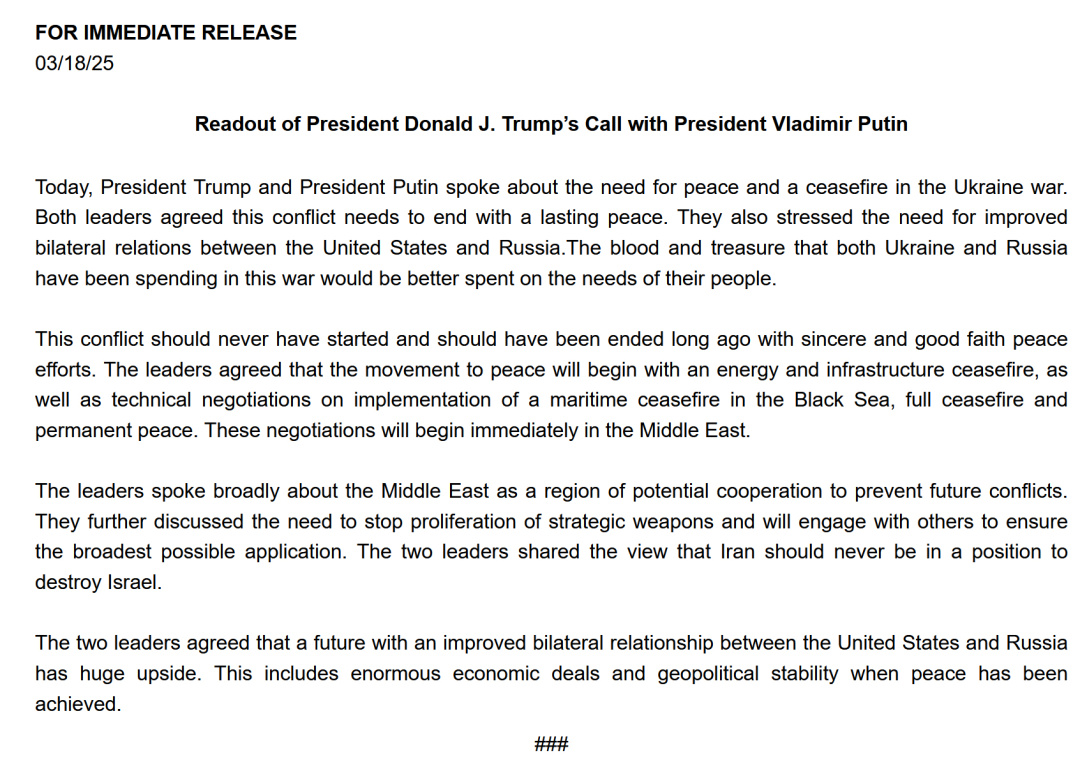 «Лідери домовилися, що рух до миру розпочнеться з припинення вогню (по об’єктах – ред.) у сферах енергетики та інфраструктури, а також технічних переговорів щодо імплементації припинення вогню в Чорному морі, повного припинення вогню та постійного миру»,- зазначається в повідомленні.