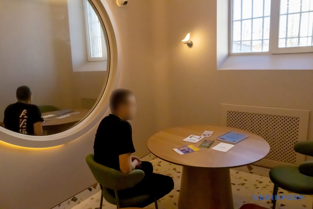 Нарешті з камери приводять нашого майбутнього співрозмовника. Хлопець одягнений по-домашньому, у темні, спортивного крою, речі. У м’який стілець сідає спиною до відеокамери нашого оператора – так було домовлено заздалегідь.