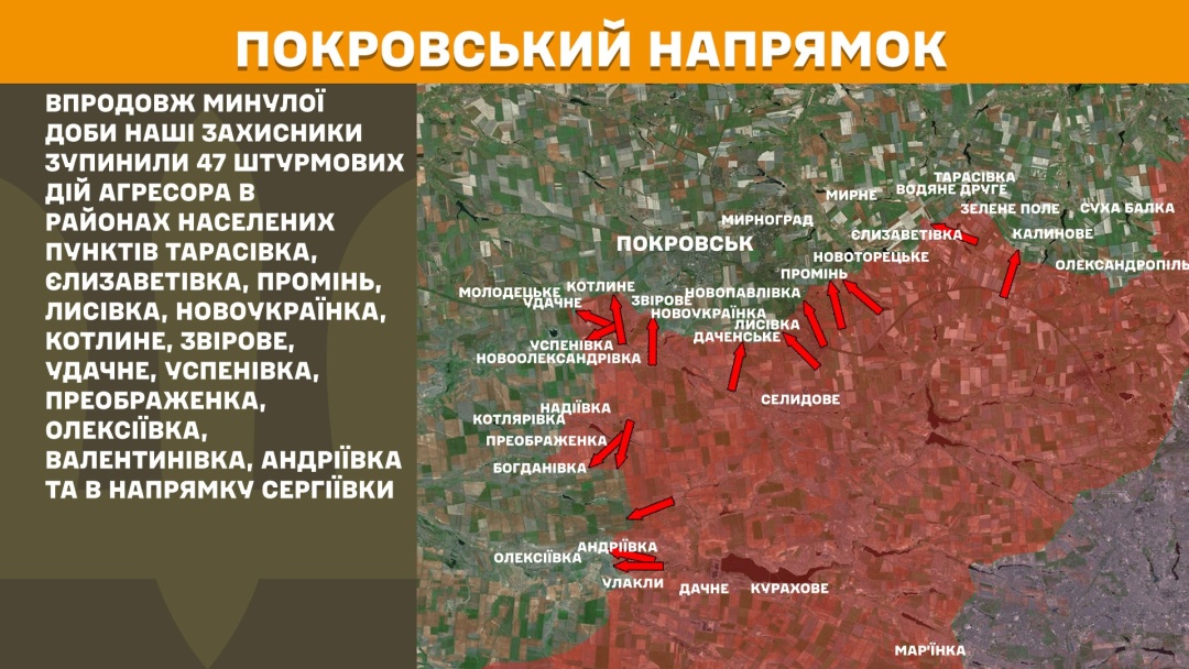 На Покровському напрямку впродовж минулої доби Сили оборони зупинили 47 штурмових дій агресора в районах населених пунктів Тарасівка, Єлизаветівка, Промінь, Лисівка, Новоукраїнка, Котлине, Звірове, Удачне, Успенівка, Преображенка, Олексіївка, Валентинівка, Андріївка, Сергіївка.