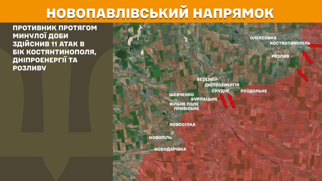 На Новопавлівському напрямку російська армія здійснила 11 атак у бік Костянтинополя, Дніпроенергії та Розлива.