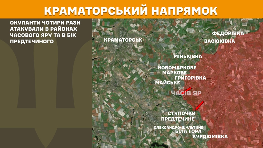 На Краматорському напрямку загарбники чотири рази атакували в районах Часового Яру та в бік Предтечиного.