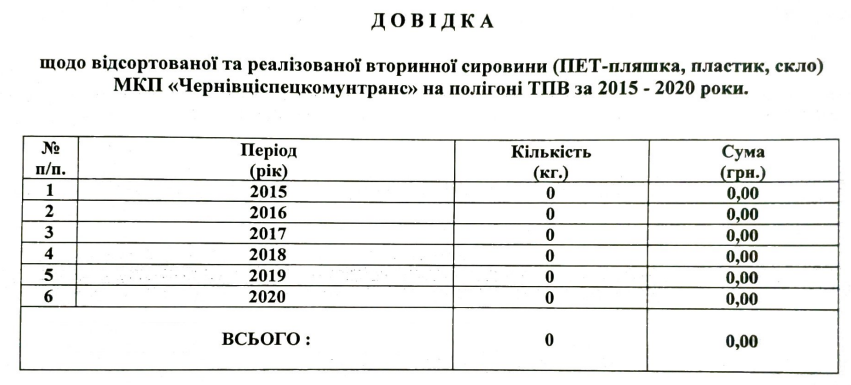 З 2015 по 2020 рік Чернівціспецкомунтранс не сортувало та не реалізувало вторсировину. Тож не було і доходів.