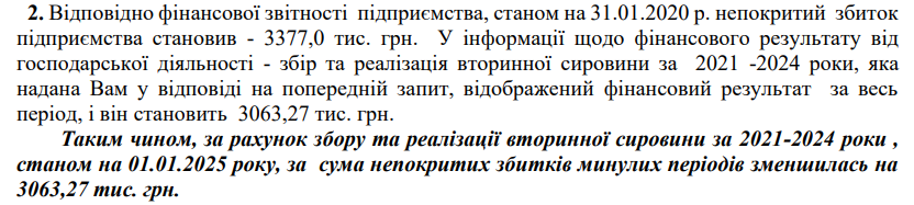 Так, станом на 31 січня 2020 року непокритий збиток підприємства сягав 3 мільйонів 377 тисяч гривень.
