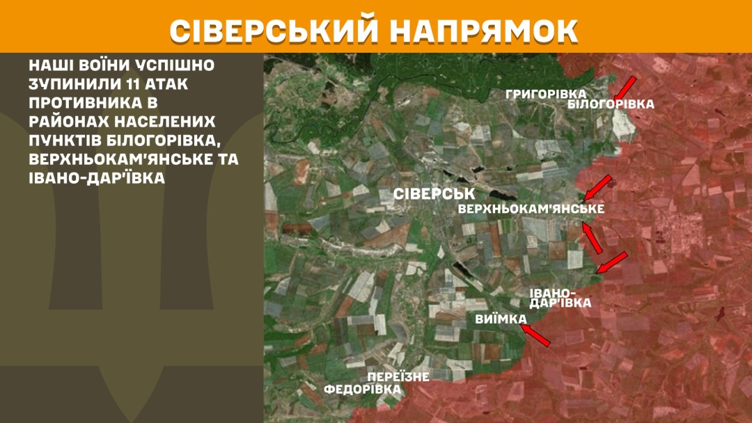На Сіверському напрямку українські військові зупинили 11 ворожих атак у районах Білогорівки, Верхньокам’янського та Івано-Дар’ївки.